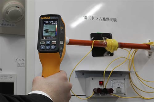 現場作業で頻繁に使われる電工ドラムを巻いたまま使用するとどのような状態になるのかを実験することができます。