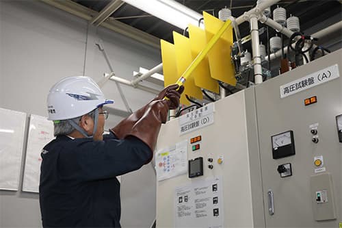 オープン変電設備の実機で耐圧試験、リレー試験の仕方について学習することが出来ます。